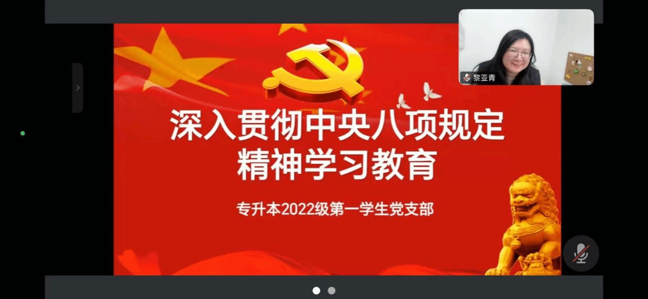 为深入贯彻落实党的二十大精神,持续深化作风建设,beat365官方网站专升本2022级第一学生党支部于3月28日组织全体党员开展深入贯彻中央八项规定精神学习教育活动。