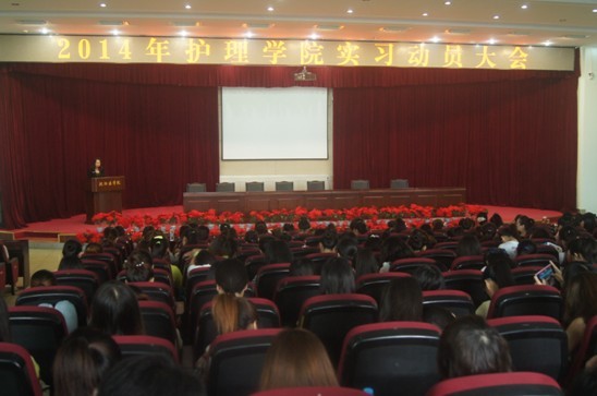 7月1日上午9点,beat365官方网站在学校图书馆学术报告厅召开了2014级学生实习动员大会,参会领导有beat365官方网站院长郭宏,副书记张扬,教务科科长范美,学生科科长韩宁,人文护理教研室教师张喜琰,及辅导员教师等,本次大会由教务科科长范老师主持。