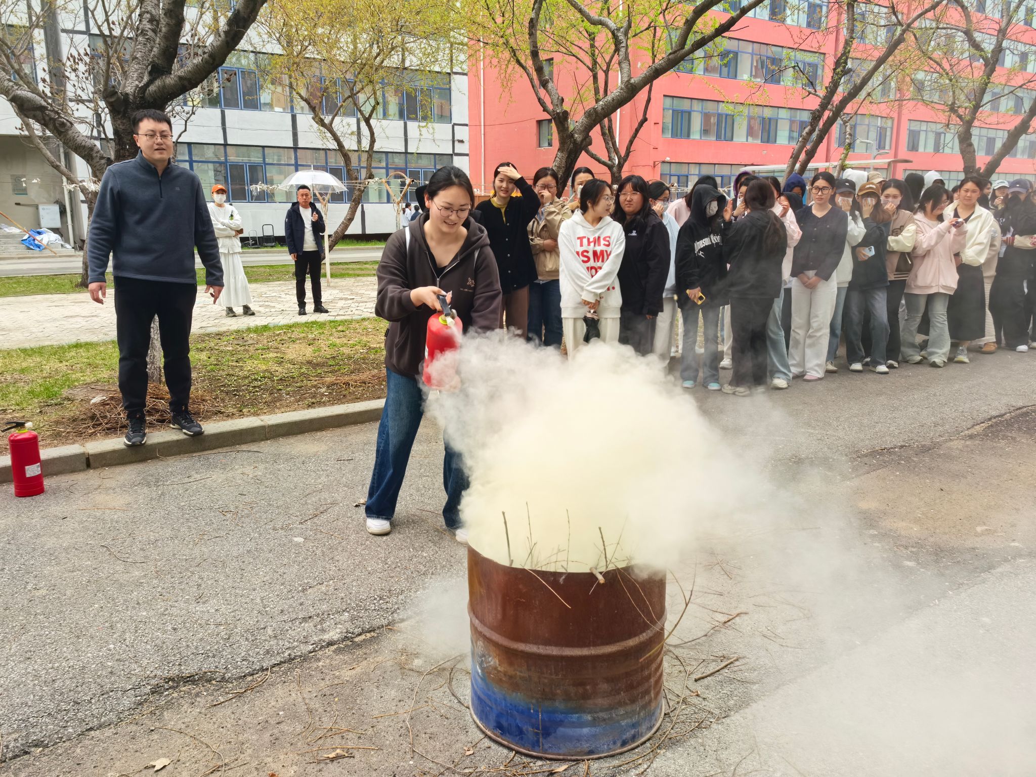 在理论讲解的基础上同学们进行了现场示范。他们手持灭火器,一边操作一边讲解:“使用灭火器时,要牢记‘提、拔、握、压’四字口诀。首先提起灭火器,然后拔掉保险销,接着握住喷管,最后用力压下压把,对准火焰根部进行喷射。”示范动作熟练、规范,让同学们对灭火器的使用有了更直观的认识。