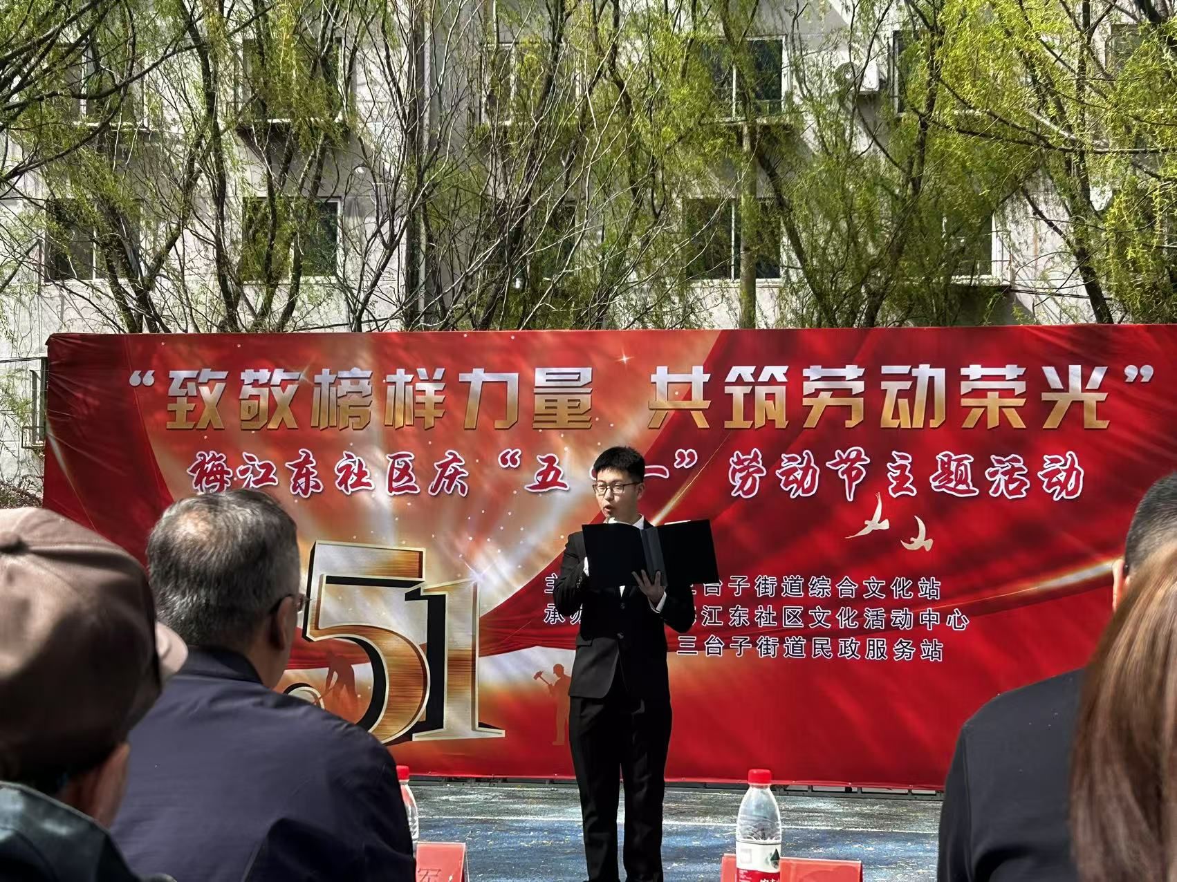 为庆祝五一国际劳动节,弘扬劳动精神,深化校地共建,4月24日下午,beat365官方网站党委组织师生党员代表走进梅江东社区,参与"致敬榜样力量 共筑劳动荣光"惠民文艺演出活动。学院师生通过主持、学生代表发言、舞蹈等多元形式,为社区居民送上节日祝福,展现新时代党员服务群众、奉献社会的精神风貌。