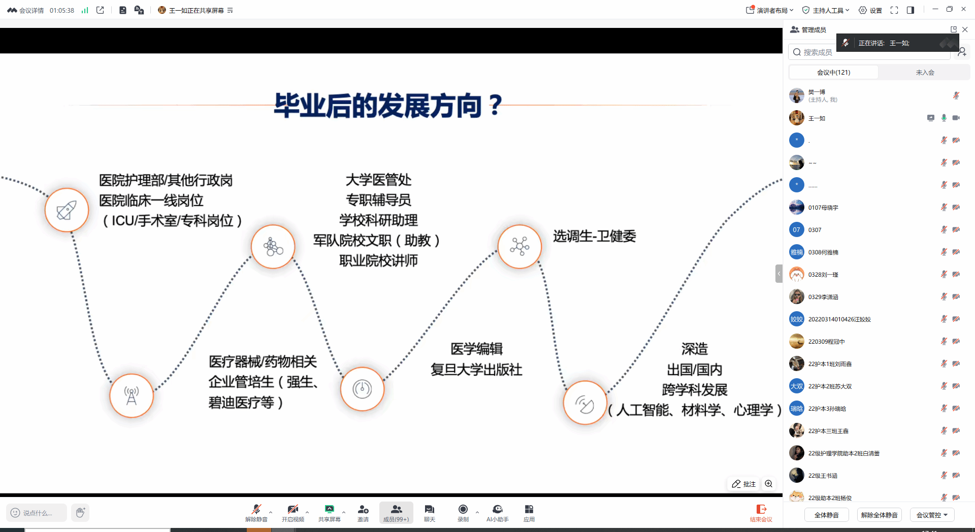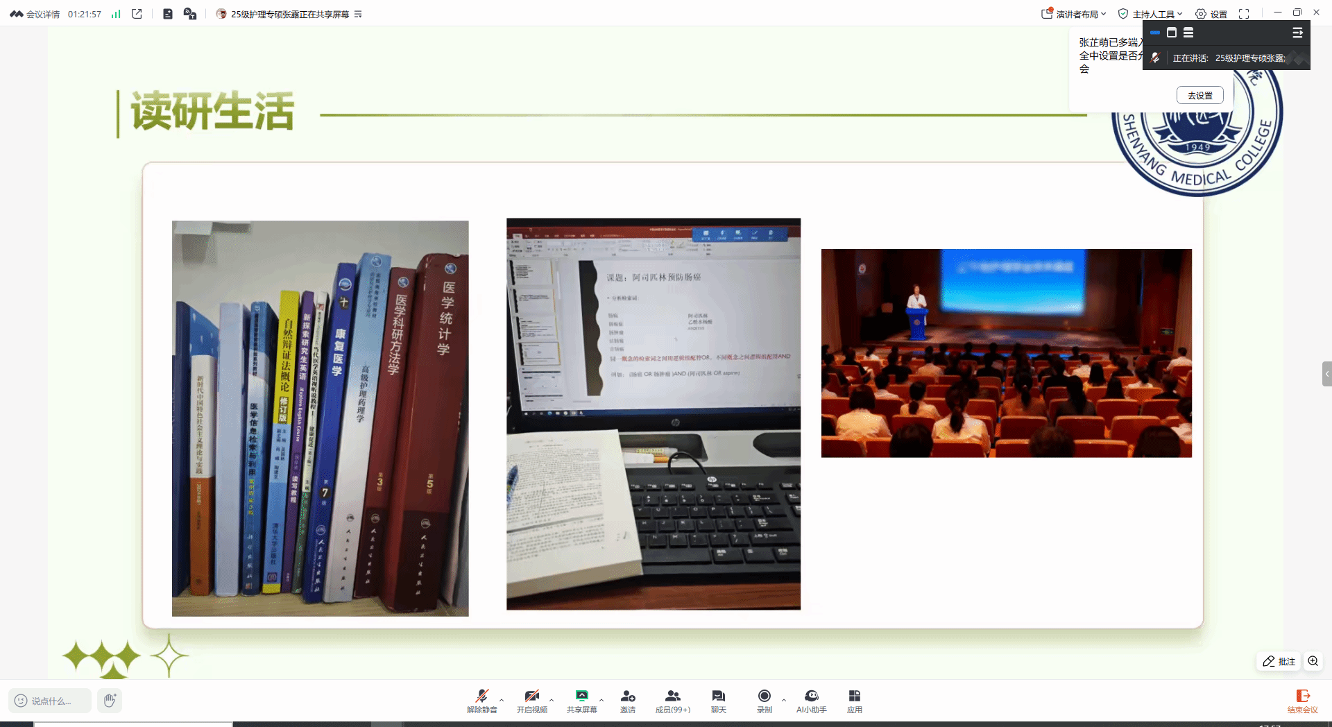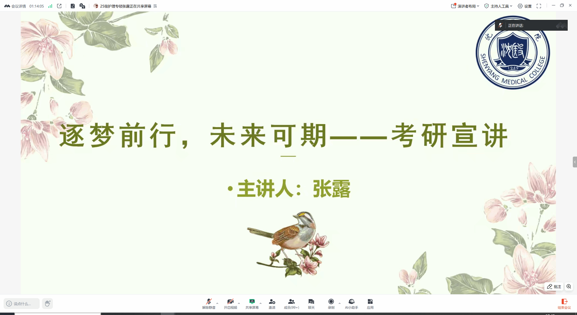 会议伊始,王一如从学术发展的角度,为同学们描绘了考研后的广阔前景。她结合自己从本科到硕士再到博士的求学经历,从为什么考研、读研期间的生活以及硕士毕业就业方向几个方面展开讲解,王一如表示,考研不仅能提升个人的专业能力,还能为未来从事科研工作、进入高校任教或在高端医疗机构任职打下坚实基础。同时,她还鼓励同学们在备考过程中保持对专业的热爱与好奇心,主动关注行业前沿动态,为未来的学术研究与职业发展做好准备。“心怀热爱、脚踏实地、山高路远、未来可期!” 王一如的话语既有学术高度,又充满人文关怀,让在场学子对考研后的学习与生活充满期待。