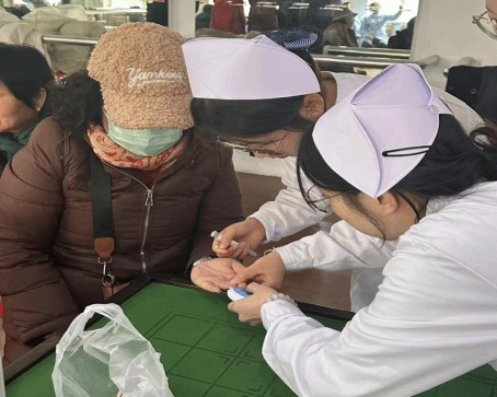 同学们也为老人们提供了量血压和测血糖的服务,他们耐心地为每位老人进行检查,并根据结果给予健康建议。这项服务不仅让老人们对自己的健康状况有了更清晰的了解,也让学生们有机会将所学知识应用于实践。